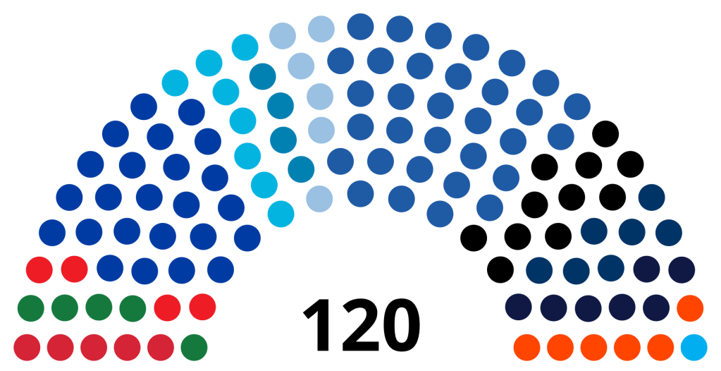 It seems that there 120 elected members. What is extraordinary is that Israeli politics is so fragmented that the party presently ruling, Likud [https://en.wikipedia.org/wiki/Likud], has only 30 members out of that 120. Indeed, the whole minority government coalition headed by Likud only has 54 members.
