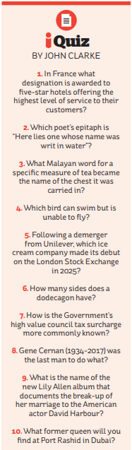 Well, this week 6/10, trumping political journalist John Rentoul’s 4/10. I did not know the answers to questions 8 and 9, and could not think quickly enough to get the right answers to questions 1 and 4 (which I “really knew” somewhere or other). So 6/10…