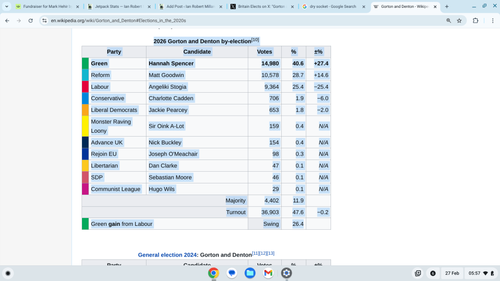 Social media is already alive with idiotic white “me-too” type anti-Reform tweeters etc, all saying what a humiliation this has been for Reform and for Matt Goodwin personally. Really? Reform doubled its percentage share of the vote since 2024, less than 2 years ago. True, the Greens tripled their 2024 vote, but Labour halved their share.