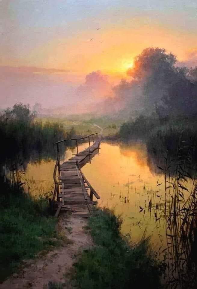 [Roman Bozhkov, Bridge . Reminds me of the wooden, narrow, and very dilapidated bridge —but without any handrail!— which I used in early 1982 to get from the shore of a lake on the border of West and East Germany to a tiny island, where there was a birdwatchers’ hut (no glass in the window, and a leaky roof), and in which I had to sleep one night]